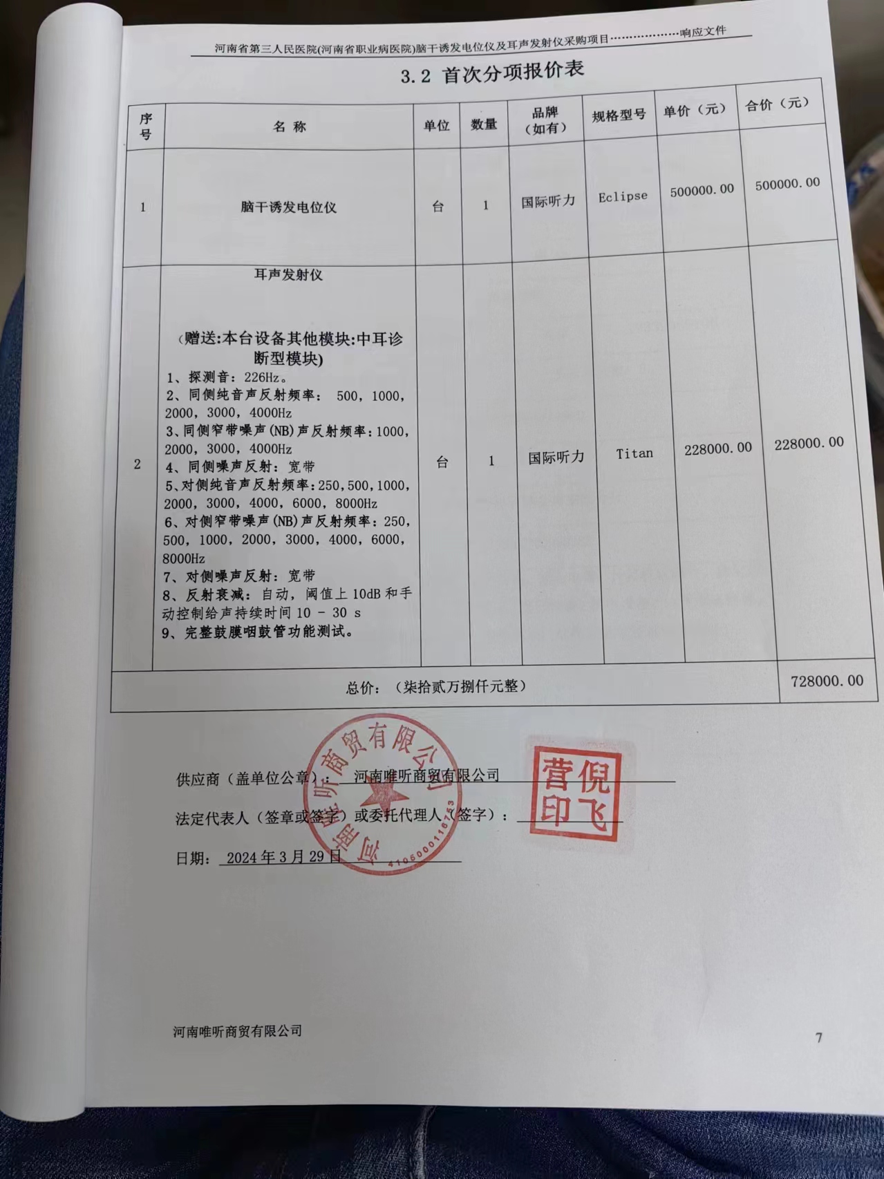 河南省第三人民醫(yī)院(河南省職業(yè)病醫(yī)院)腦干誘發(fā)電位儀及耳聲發(fā)射儀采購項目 | 河南唯聽商貿(mào)有限公司 | 安陽市北關區(qū)解放路鴻泰公寓1幢大樓中間辦公樓一樓大門東側(cè) | 723000.00 | 金額 | 元 | ||||