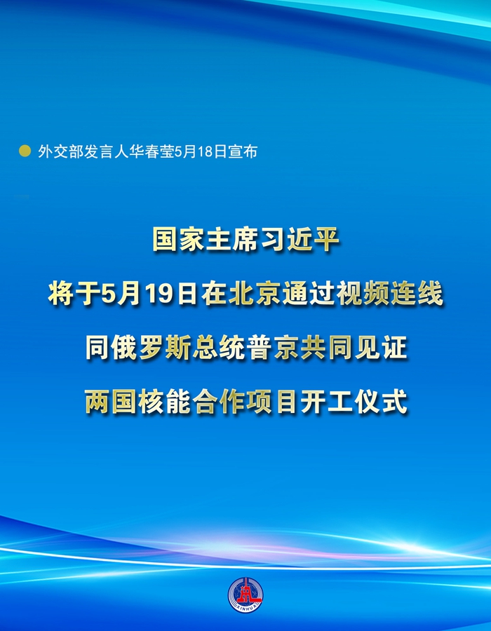 新華社北京5月18日電 外交部發(fā)言人華春瑩18日宣布:國家主席習近平將于5月19日在北京通過視頻連線,同俄羅斯總統(tǒng)普京共同見證兩國核能合作項目開工儀式。