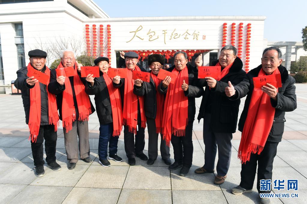 2月3日,在安徽省滁州市鳳陽(yáng)縣小崗村,8位“大包干”帶頭人在大包干紀(jì)念館前展示自家領(lǐng)取的集體經(jīng)濟(jì)收益股權(quán)分紅。新華社記者 周牧 攝