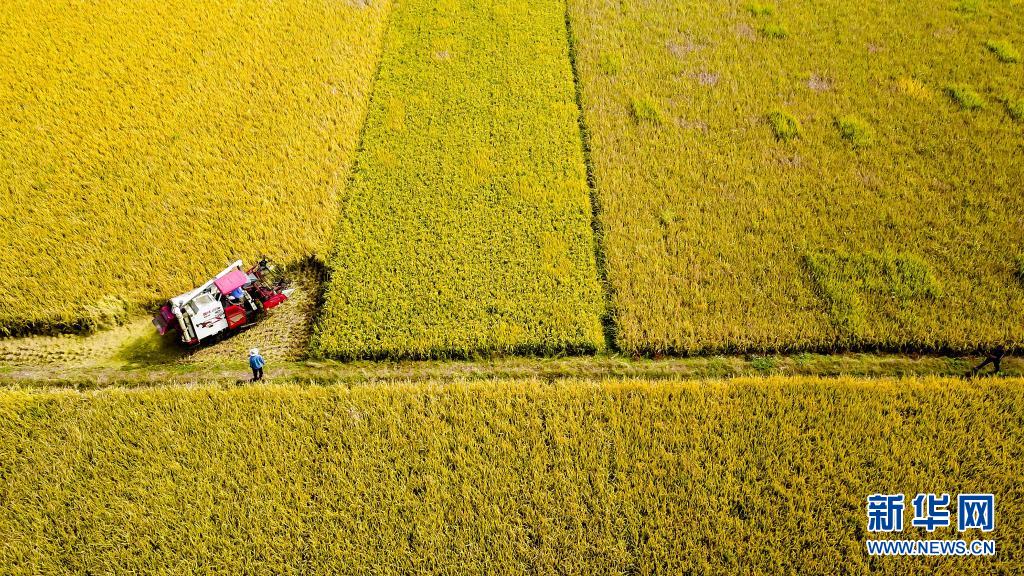 2020 年 10 月 21 日,在山東省棗莊市臺(tái)兒莊區(qū)邳莊鎮(zhèn),收割機(jī)在收獲水稻(無(wú)人機(jī)照片)。 新華社記者 郭緒雷 攝