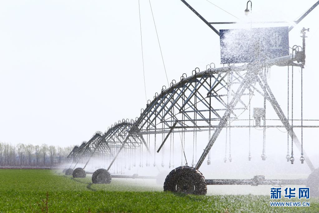 2021 年 2 月 23 日,在河南省鶴壁市??h一片高標(biāo)準(zhǔn)農(nóng)田里,自走式噴灌機(jī)在為小麥澆水。 新華社記者 許雅楠 攝