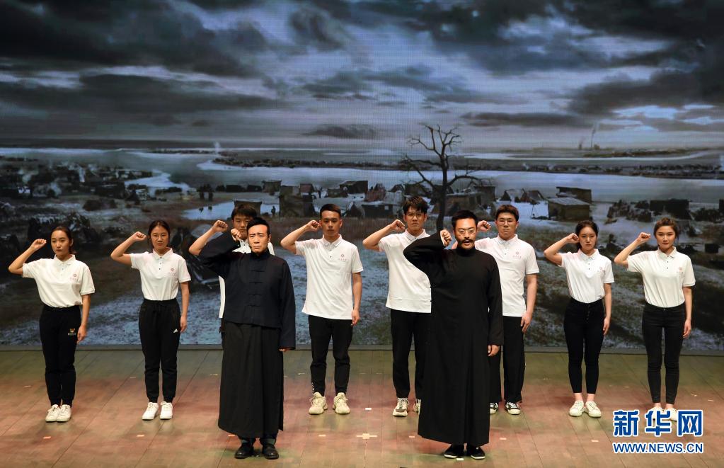 2021年4月20日,在電視劇《覺醒年代》主創(chuàng)團隊走進北大活動中,劇中陳獨秀扮演者于和偉(前左)、李大釗扮演者張桐(前右)與北大學(xué)生同臺演出。新華社記者 任超 攝