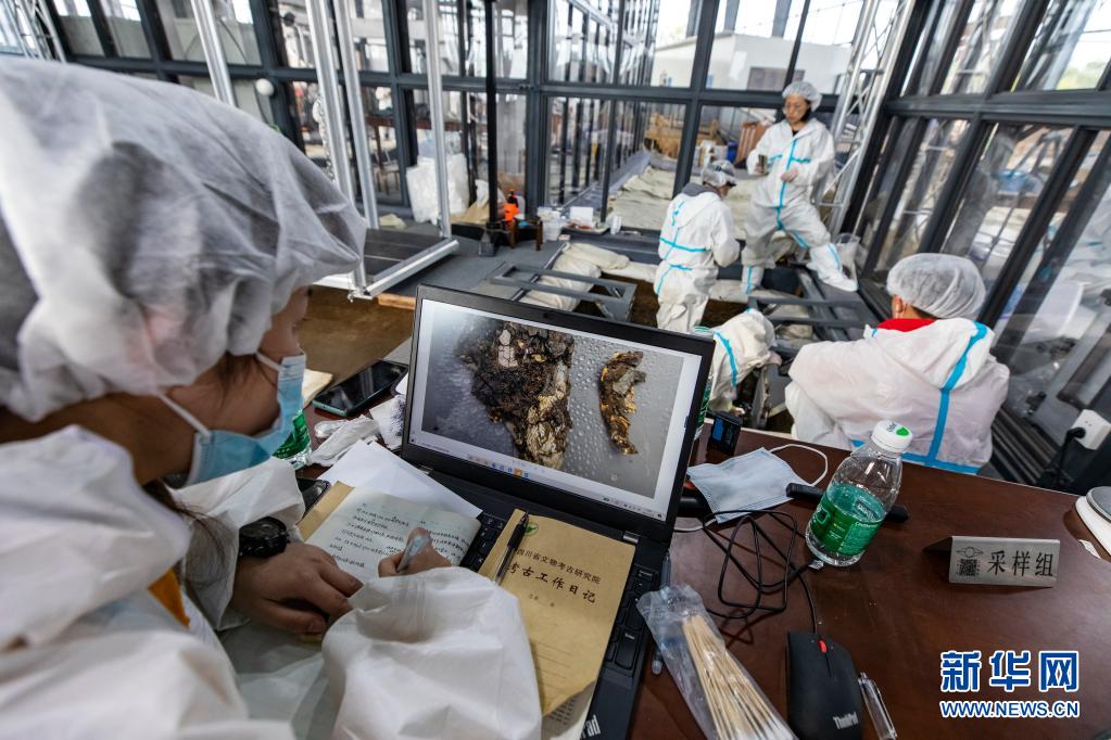 2021年3月10日,在三星堆遺址考古發(fā)掘現(xiàn)場,考古人員利用電腦現(xiàn)場查看新發(fā)現(xiàn)的象牙雕,并進行記錄。新華社記者 沈伯韓 攝