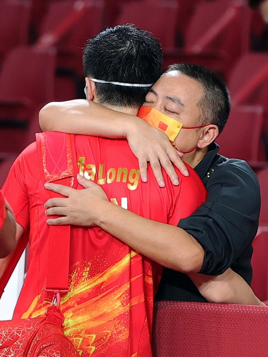 7月29日,劉國梁(右)和馬龍慶祝勝利。當(dāng)日,在東京奧運會乒乓球項目男子單打半決賽中,中國選手馬龍以4比3戰(zhàn)勝德國選手奧恰洛夫,晉級決賽。新華社記者 王東震 攝