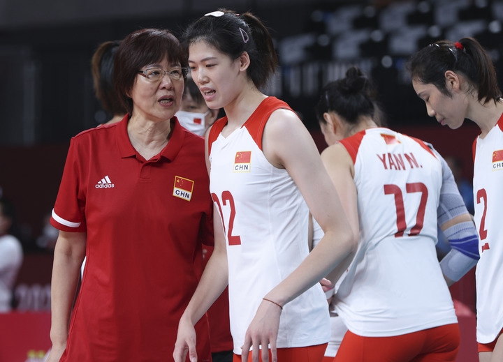7月29日,中國隊主教練郎平(前左)在比賽間隙指導(dǎo)球員李盈瑩。當(dāng)日,在東京奧運會女排小組賽中,中國隊以2比3不敵俄羅斯運動員。新華社記者 丁汀 攝
