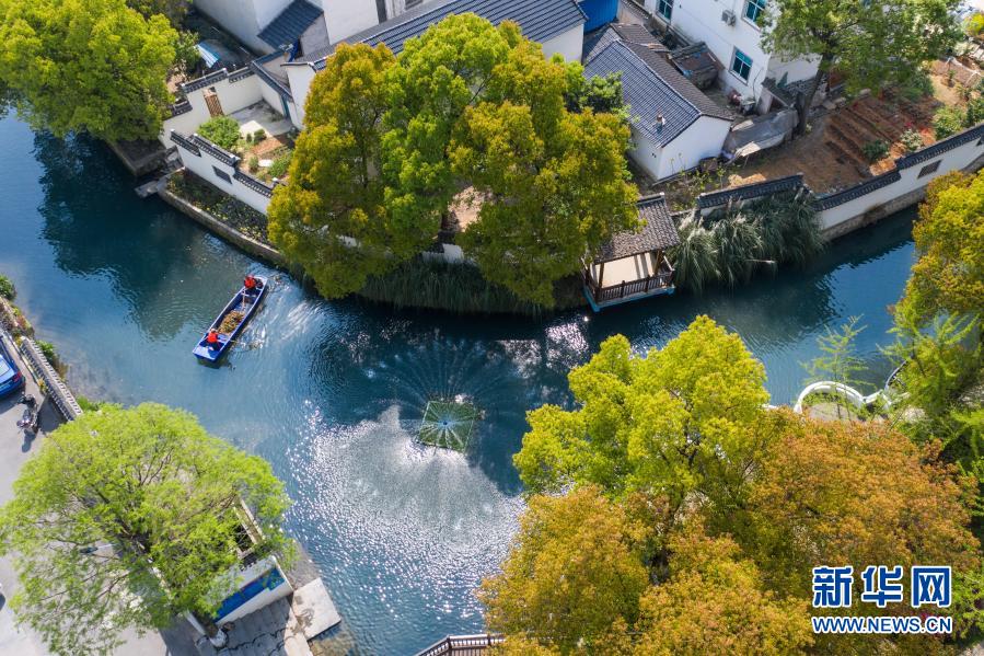 浙江省長(zhǎng)興縣龍山街道渚山村,保潔人員進(jìn)行日常河道護(hù)理巡查(4月9日攝,無人機(jī)照片)。新華社記者 徐昱 攝
