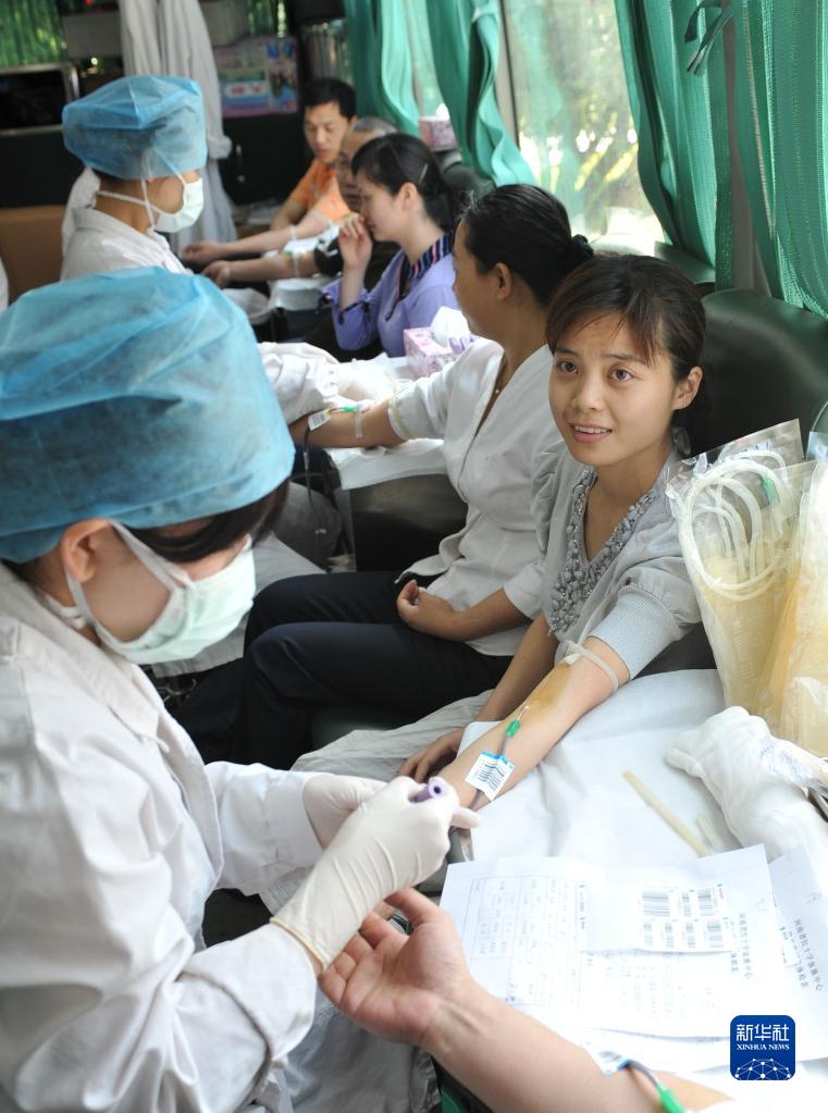 鄭州市委干部肖靜在流動獻(xiàn)血車上獻(xiàn)血(2008年5月14日攝)。2008年5月14日,數(shù)百名鄭州市直機關(guān)干部職工參加援助活動,并為汶川地震災(zāi)區(qū)的受災(zāi)群眾獻(xiàn)血。新華社記者 趙鵬 攝