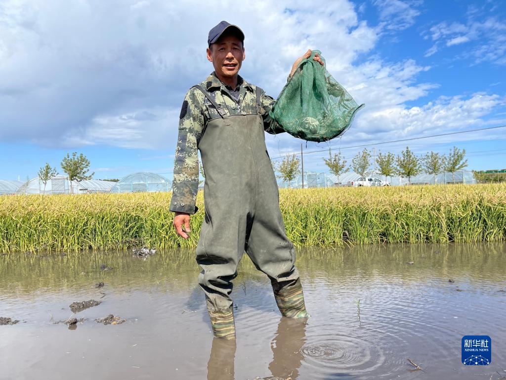 黑龍江省北安市城郊鄉(xiāng)革命村村民李學(xué)軍展示從稻田里捕撈的河蟹(9月17日攝)。新華社記者 楊思琪 攝