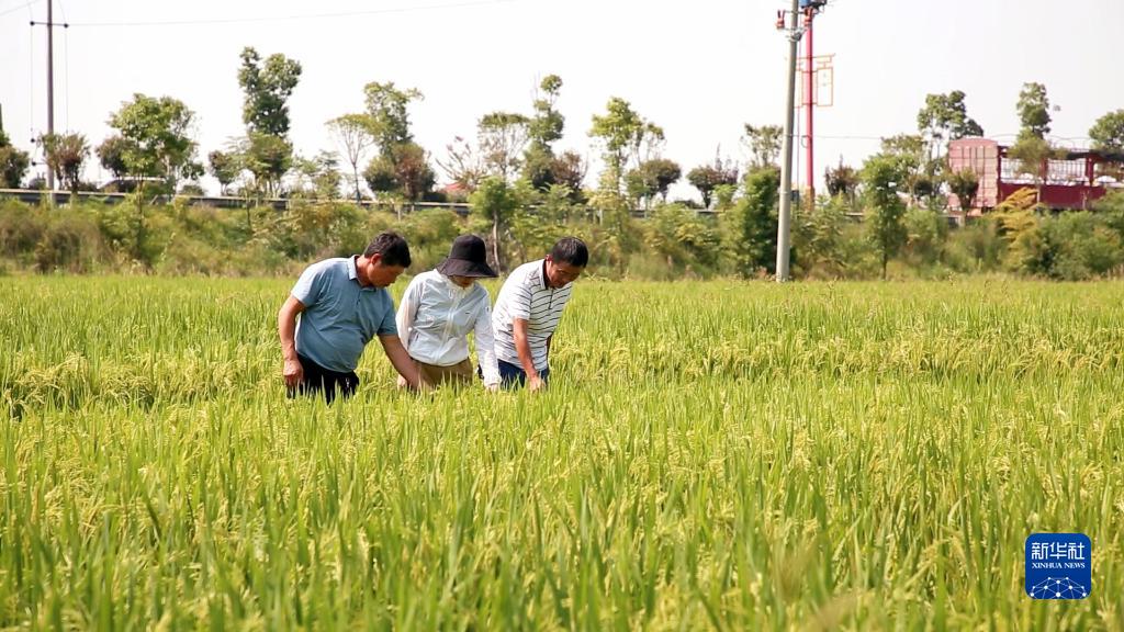 在汨羅鎮(zhèn)江景村,汨羅市農(nóng)業(yè)農(nóng)村局的兩名技術(shù)人員正查看“泰優(yōu)390”的結(jié)實率。根據(jù)各家情況,他們向村民們科普如何更好地做到綠色病蟲害防控、調(diào)整農(nóng)藥和化肥用量。
