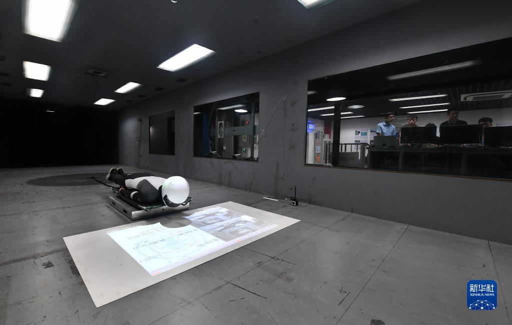 在北京交通大學(xué)風(fēng)洞實(shí)驗(yàn)室,風(fēng)洞輔助訓(xùn)練系統(tǒng)顯示的信息將運(yùn)動速度、運(yùn)動風(fēng)阻力、運(yùn)動姿態(tài)及測試指令實(shí)時(shí)反饋給測試人員(2021年7月16日攝)。新華社記者 任超 攝