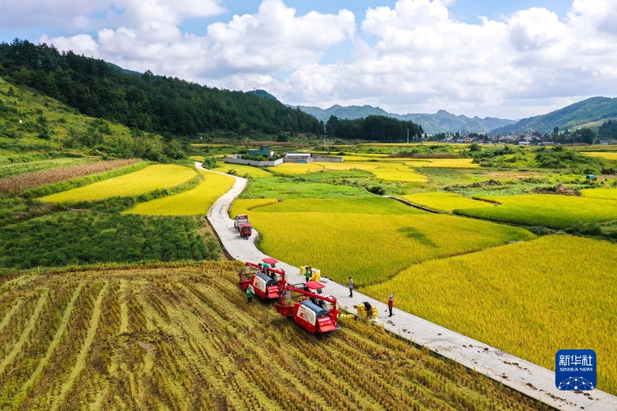 2021年9月15日,貴州省龍里縣灣灘河鎮(zhèn)羊場(chǎng)社區(qū)的農(nóng)民在搶收稻谷(無人機(jī)照片)。 新華社記者 楊文斌 攝
