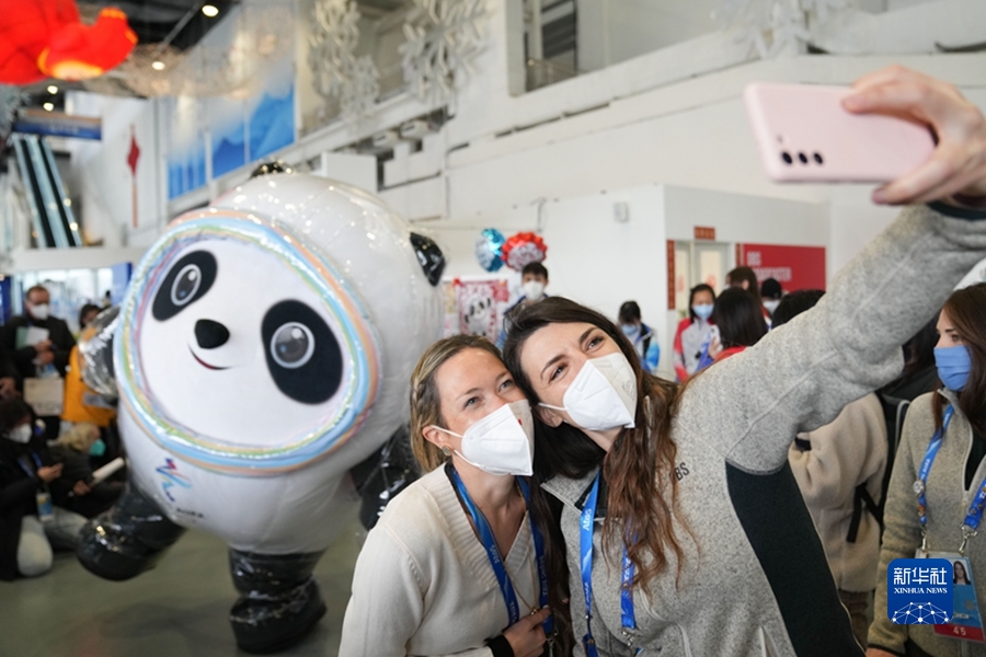 2月12日,北京冬奧會(huì)主媒體中心舉辦集體采訪活動(dòng),現(xiàn)場(chǎng)觀眾與北京2022年冬奧會(huì)吉祥物“冰墩墩”自拍留念。 新華社記者 鞠煥宗 攝