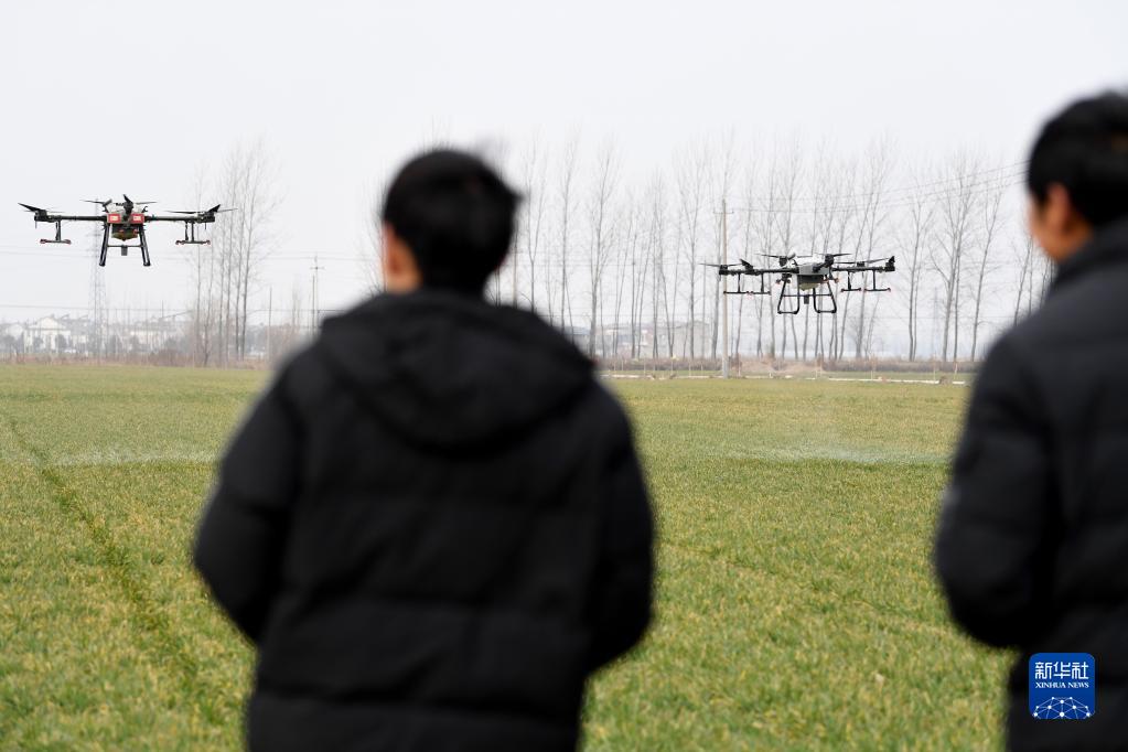 2月11日,無人機(jī)在安徽省亳州市趙橋鄉(xiāng)“無人農(nóng)場”噴灑除草劑。新華社記者 劉軍喜 攝