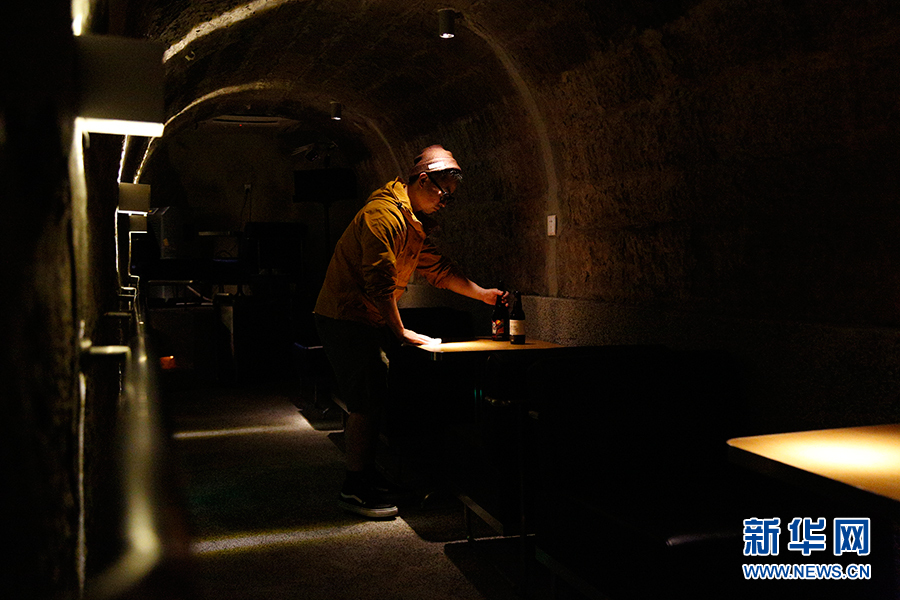 工作人員在利用防空洞改造的酒吧內(nèi)整理桌面。(2021年11月11日攝)新華網(wǎng) 耿駿宇 攝