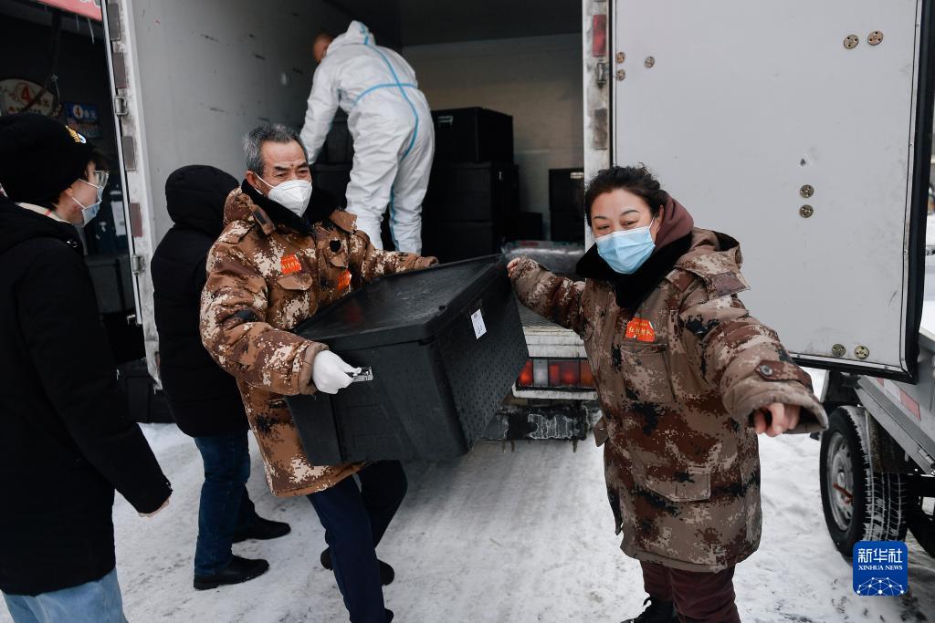 趙淑華(右一)指揮社區(qū)工作人員和志愿者搬運盒飯(2021年2月15日攝)。趙淑華是吉林省通化市東昌區(qū)團結街道文化社區(qū)副主任、網格長,臨近退休的她毫不猶豫投身抗疫一線。新華社記者 許暢 攝