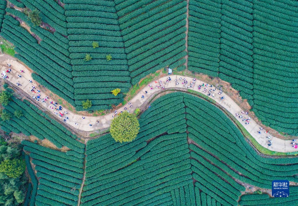 團隊游客在杭州市富陽區(qū)拔山村萬畝茶山游覽(2018年3月26日攝,無人機照片)。浙江省“千村示范、萬村整治”工程撬動了鄉(xiāng)村從美麗生態(tài)到美麗經濟,再到美好生活的良性循環(huán)。2018年,浙江“千萬工程”獲得聯合國“地球衛(wèi)士獎”中的“激勵與行動獎”。新華社記者 徐昱 攝