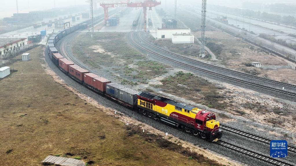 2022年1月15日,廣西新年首趟西部陸海新通道年貨班列從欽州港東站駛出(無人機(jī)照片)。新華社記者 張愛林 攝