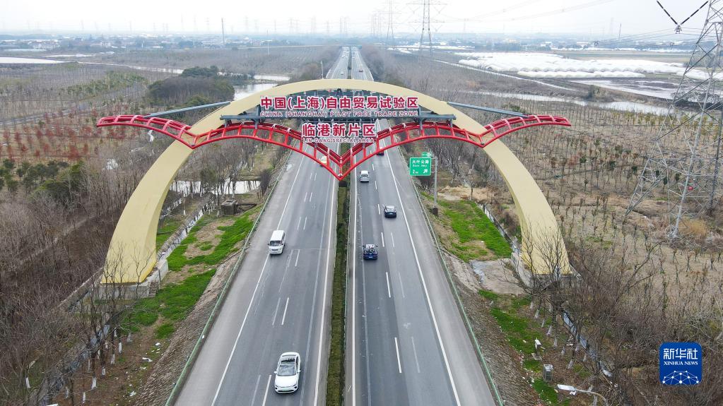 這是2022年2月10日拍攝的S2滬蘆高速上的中國(上海)自由貿(mào)易試驗區(qū)臨港新片區(qū)“海鷗門”(無人機(jī)照片)。新華社記者 方喆 攝
