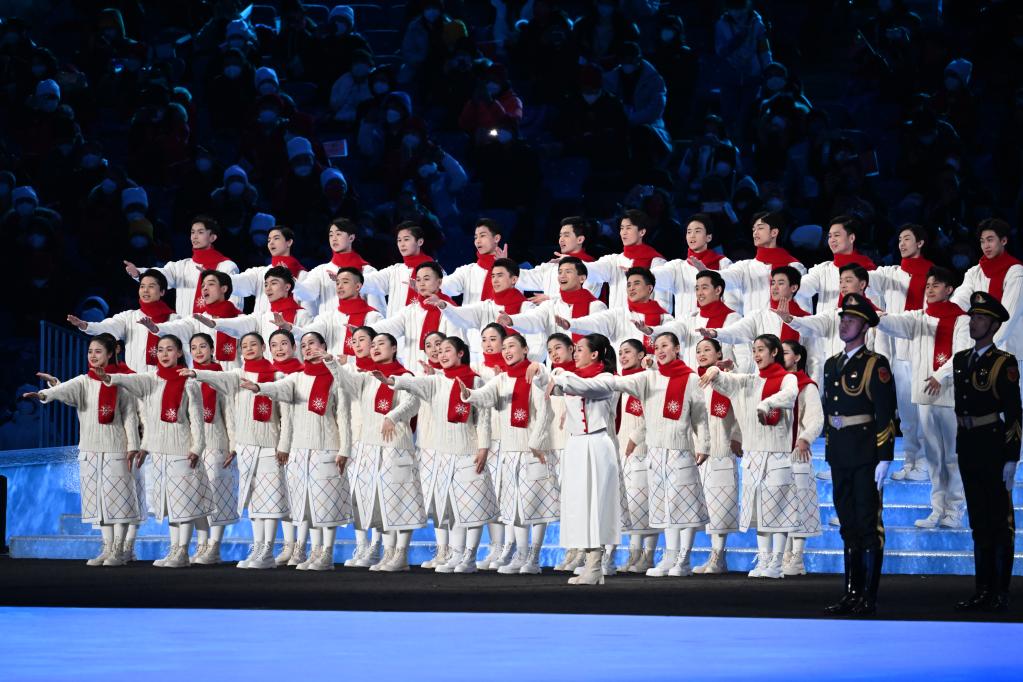 2022年3月4日晚,北京冬殘奧會開幕式上,中國殘疾人藝術團團長邰麗華帶領數(shù)十名殘疾人表演者用手語“唱”國歌。