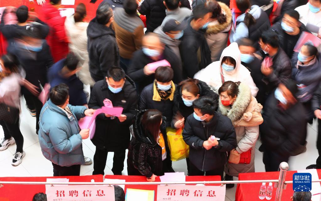求職人員在山東省滕州市“春風送崗”春季人才招聘會上尋找就業(yè)崗位(2022年2月19日攝)。 新華社發(fā)(李志軍 攝)
