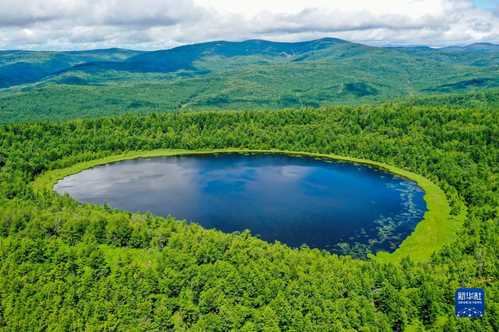 這是內(nèi)蒙古阿爾山國家森林公園內(nèi)的天池(2021年7月14日攝,無人機照片)。新華社記者 連振 攝