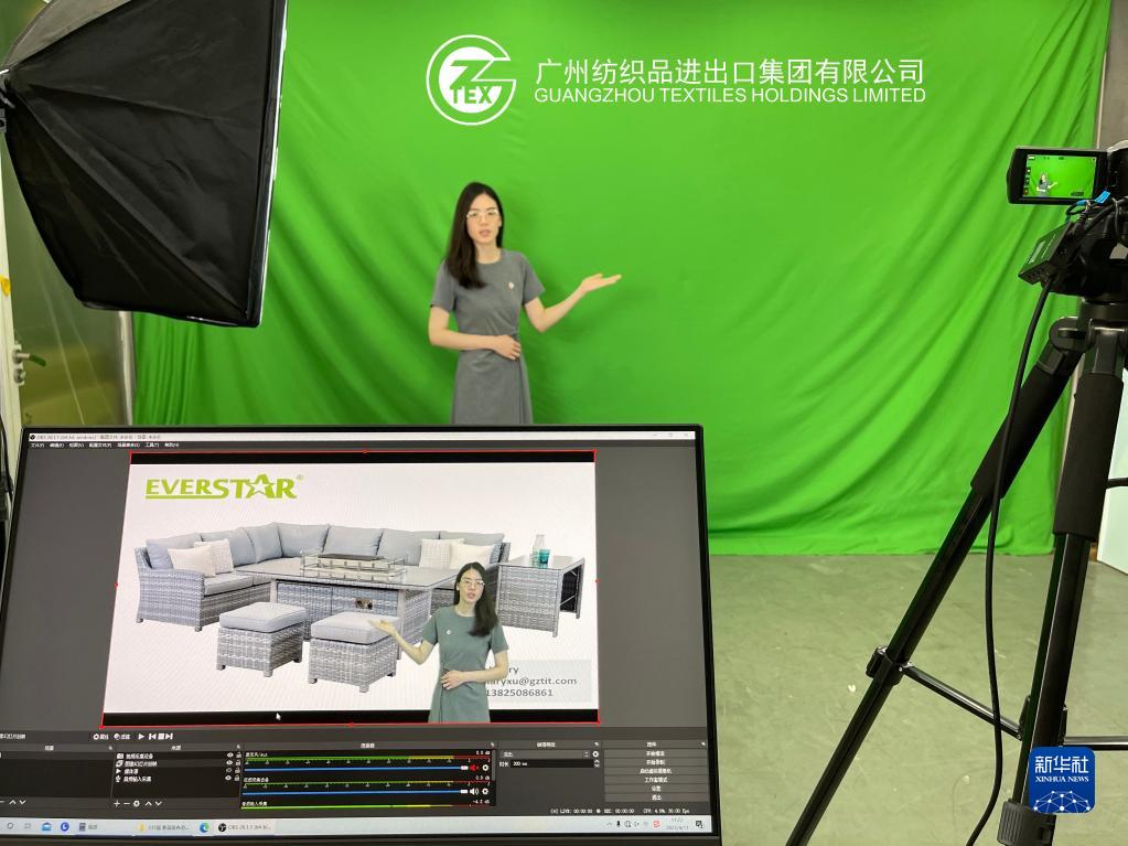 廣州輕工工貿(mào)集團(tuán)紡織品進(jìn)出口公司員工利用綠幕技術(shù)排練廣交會上“云展示”(4月11日攝)。新華社發(fā)(受訪者供圖)