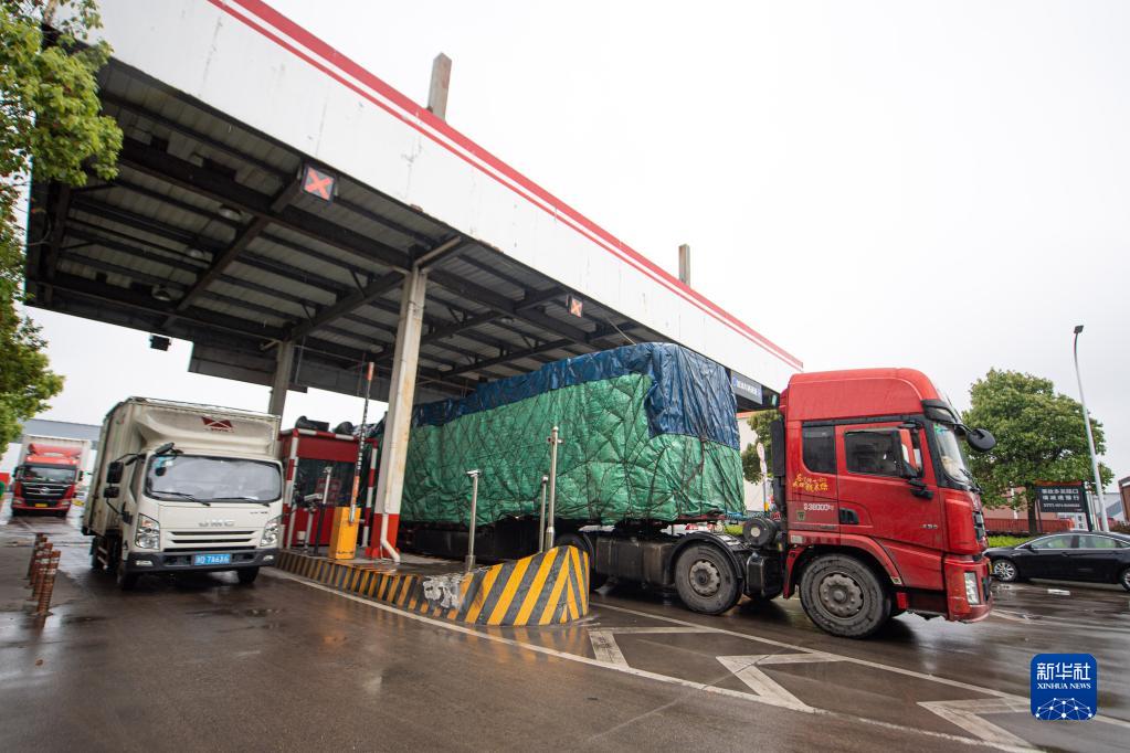 貨車駛?cè)胛挥诤贾菔绣X塘區(qū)的杭州傳化公路港(4月13日攝)。新華社記者 江漢 攝