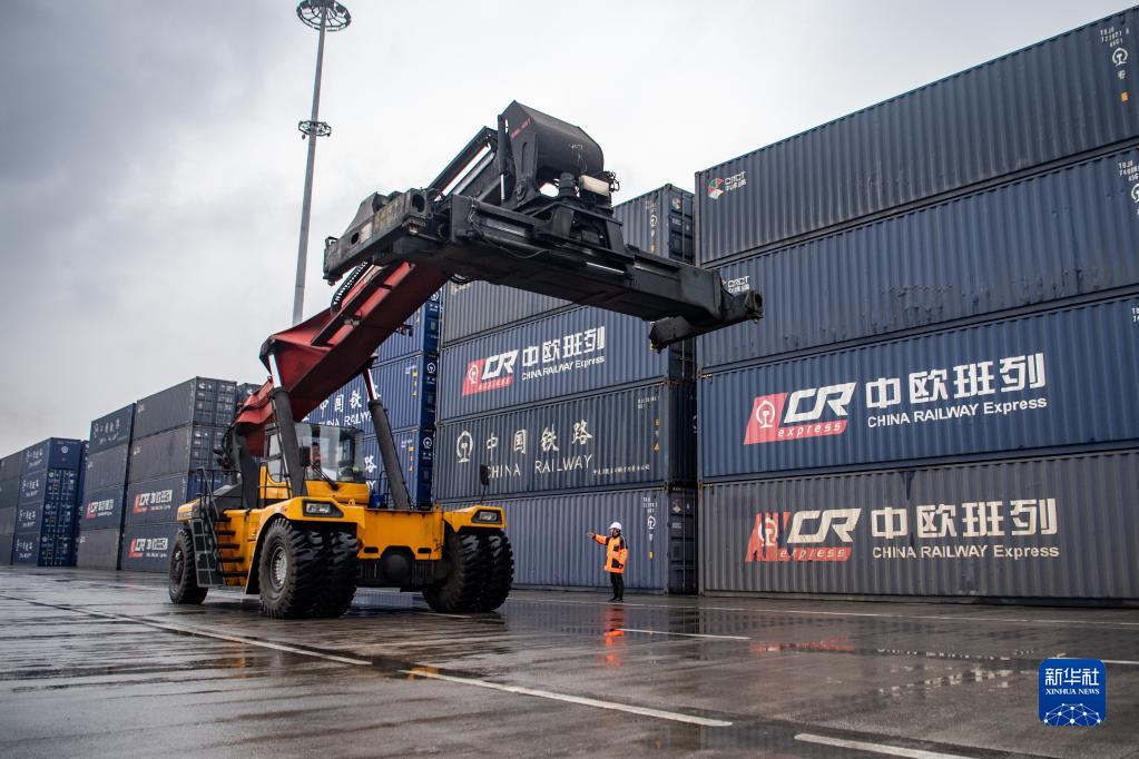 中歐班列起點(diǎn)聯(lián)合巡邏隊(duì)成員在重慶團(tuán)結(jié)村中心站貨場對作業(yè)車輛進(jìn)行現(xiàn)場指揮(1月25日攝)。新華社記者 唐奕 攝