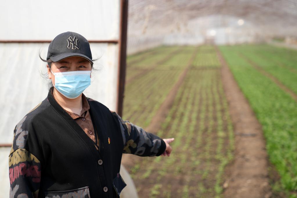 4月19日,在哈爾濱市道外區(qū)民主鎮(zhèn)光明村,村黨支部書記唐艷麗在介紹種植情況。新華社記者王建威 攝