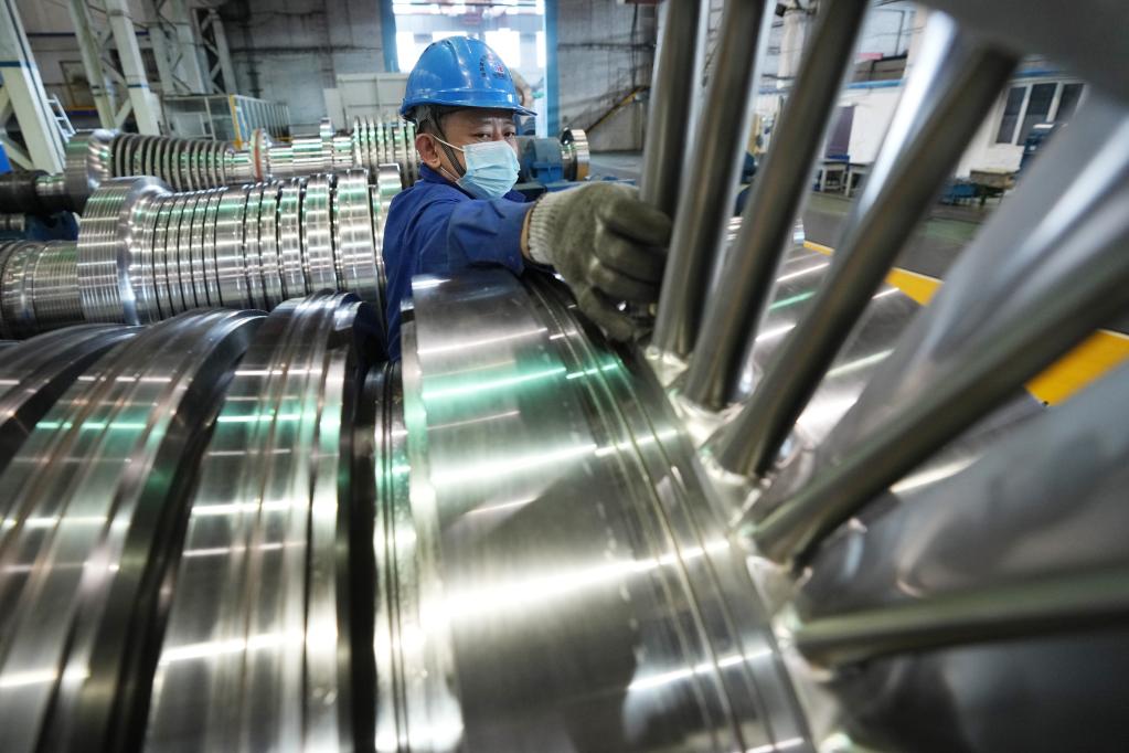 4月15日,在哈電集團(tuán)哈爾濱汽輪機(jī)廠有限責(zé)任公司車間,工人在進(jìn)行生產(chǎn)作業(yè)。新華社記者王建威 攝