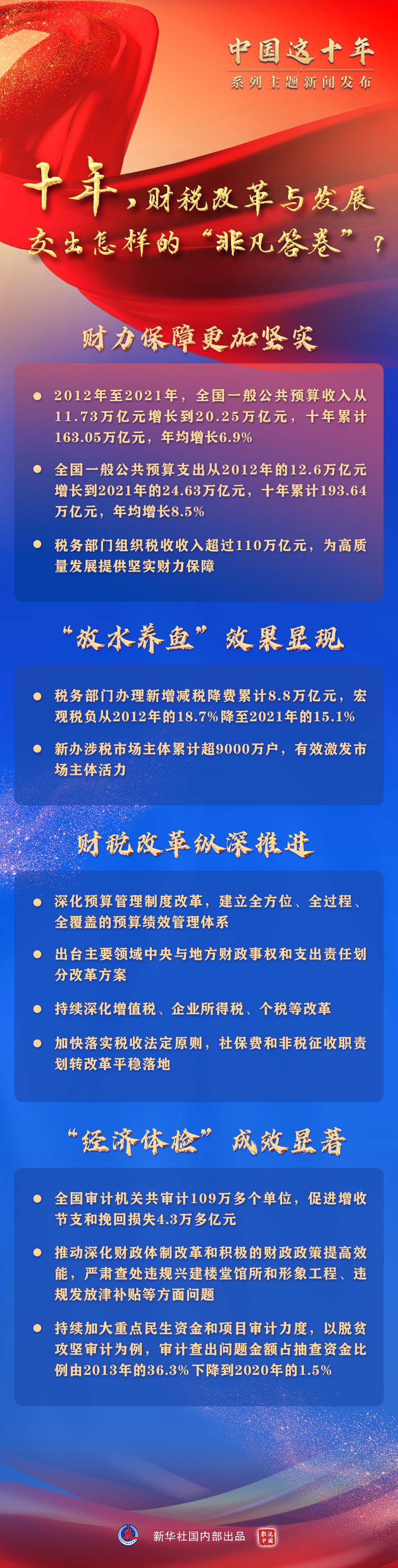 深化預(yù)算管理制度改革,建立全方位、全過程、全覆蓋的預(yù)算績效管理體系;出臺主要領(lǐng)域中央與地方財政事權(quán)和支出責(zé)任劃分改革方案;持續(xù)深化增值稅和企業(yè)所得稅改革,初步建立綜合與分類相結(jié)合的個人所得稅制度;強化財會監(jiān)督,嚴格財經(jīng)紀律……十年來,財稅體制改革縱深推進。
