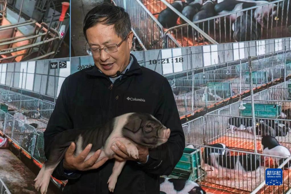 在寧鄉(xiāng)國(guó)家現(xiàn)代農(nóng)業(yè)產(chǎn)業(yè)園,中國(guó)工程院院士、中國(guó)科學(xué)院亞熱帶農(nóng)業(yè)生態(tài)研究所首席研究員印遇龍?jiān)诓榭磳庎l(xiāng)花豬(資料照片)。新華社發(fā)(受訪者供圖)