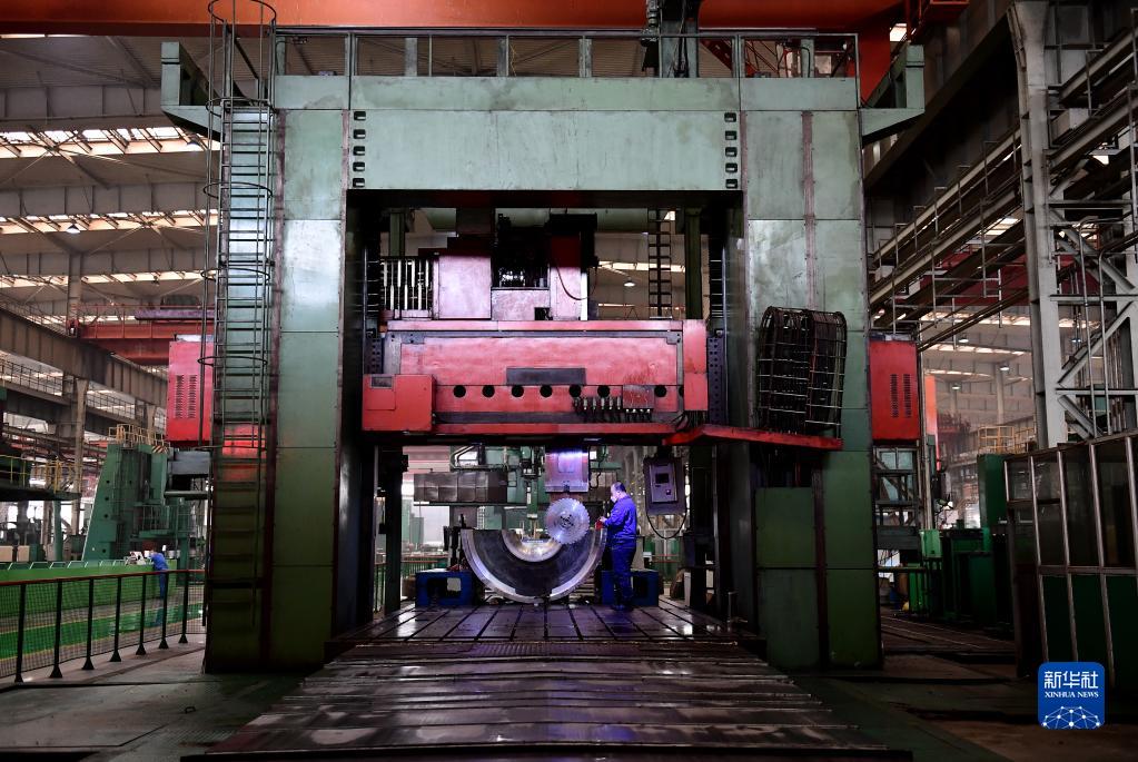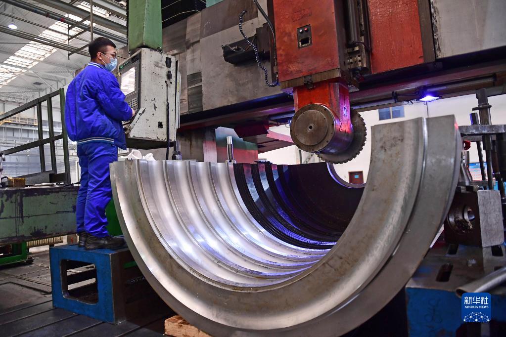 2020年3月16日,在沈陽(yáng)鼓風(fēng)機(jī)集團(tuán)股份有限公司生產(chǎn)車間,工人操作機(jī)器加工產(chǎn)品內(nèi)機(jī)殼。新華社記者 楊青 攝