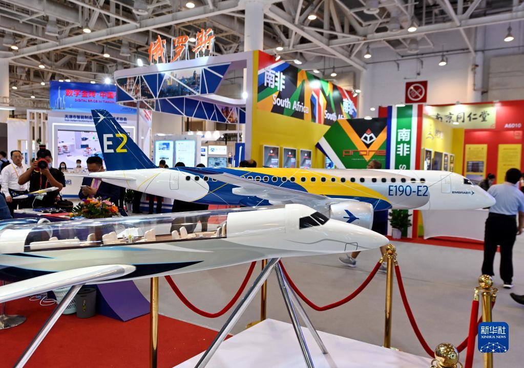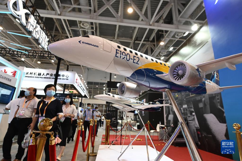 參觀者從2021金磚國(guó)家新工業(yè)革命展展出的飛機(jī)模型前走過(guò)(2021年9月8日攝)。新華社記者 林善傳 攝