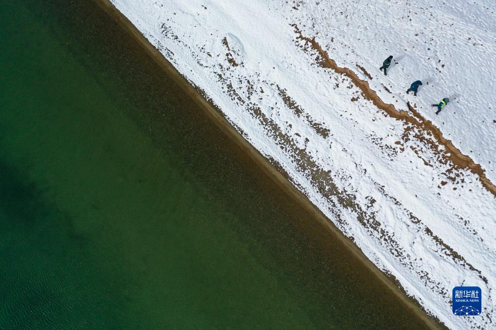 2021年10月20日,在青海省果洛藏族自治州瑪多縣扎陵湖鄉(xiāng)勒那村,三江源國家公園黃河源園區(qū)生態(tài)管護員在巡護(無人機照片)。新華社記者 張龍 攝