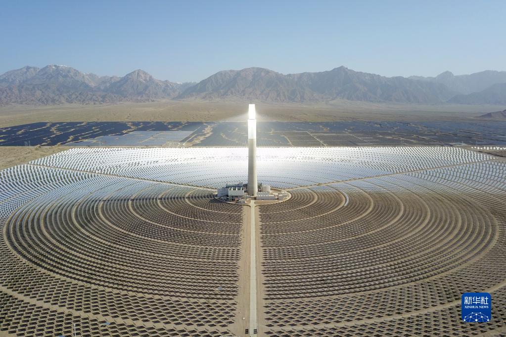 這是2022年6月8日在青海省海西蒙古族藏族自治州德令哈市光伏(光熱)產(chǎn)業(yè)園拍攝的青海中控德令哈50兆瓦光熱電站(無人機照片)。新華社記者 范培珅 攝