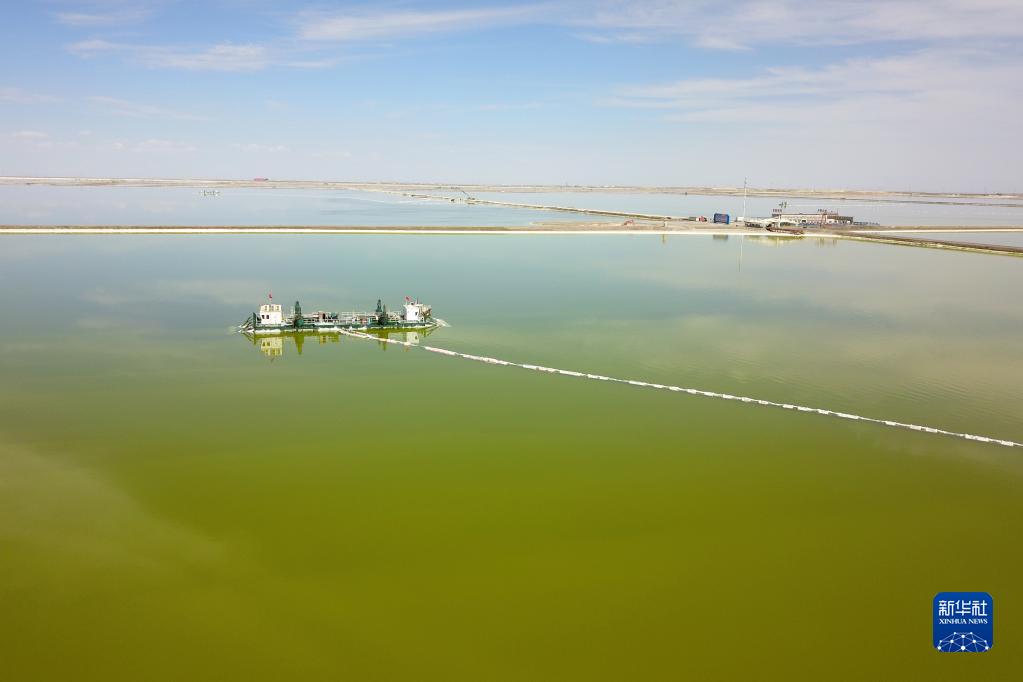 這是2022年6月13日在青海柴達木盆地拍攝的察爾汗鹽湖上的采鹽船(無人機照片)。新華社記者 范培珅 攝