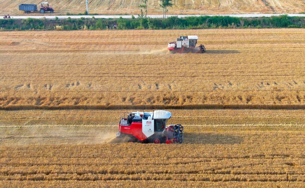 2022年6月8日,在河南省安陽市湯陰縣菜園鎮(zhèn)高標(biāo)準(zhǔn)農(nóng)田示范區(qū),收割機(jī)在麥田作業(yè)(無人機(jī)照片)。新華社記者郝源攝
