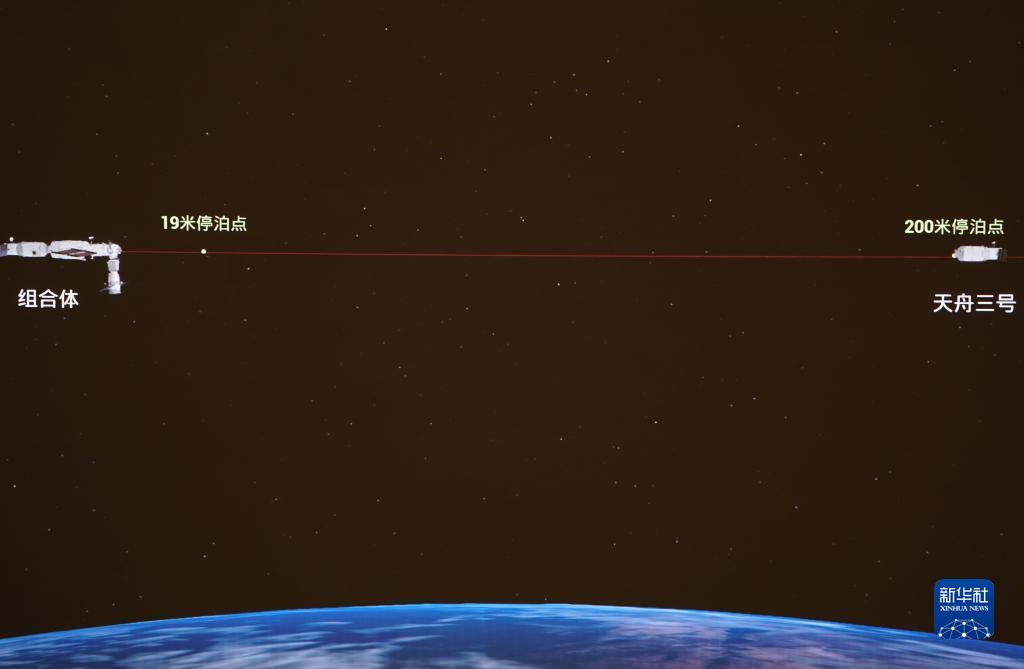 7月17日在北京航天飛行控制中心拍攝的天舟三號貨運飛船撤離空間站組合體圖像。這是天舟三號貨運飛船撤離至200米停泊點的模擬圖像。新華社記者 郭中正 攝