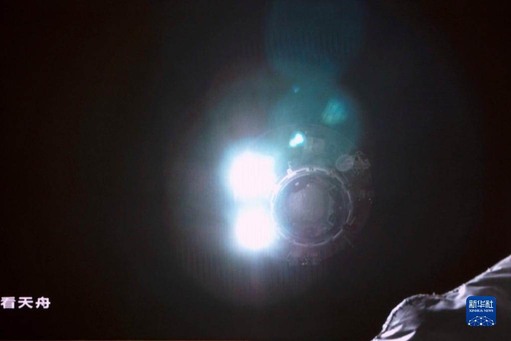 7月17日在北京航天飛行控制中心拍攝的天舟三號貨運飛船撤離空間站組合體圖像。這是天舟三號貨運飛船正在向200米停泊點撤離。新華社記者 郭中正 攝