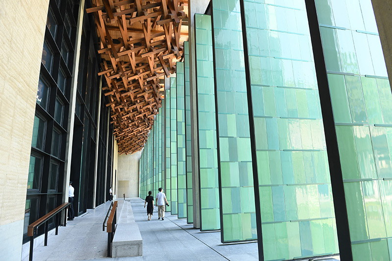 中國(guó)國(guó)家版本館杭州分館屋頂?shù)哪緲?gòu)和青瓷門(mén)扇相映成趣