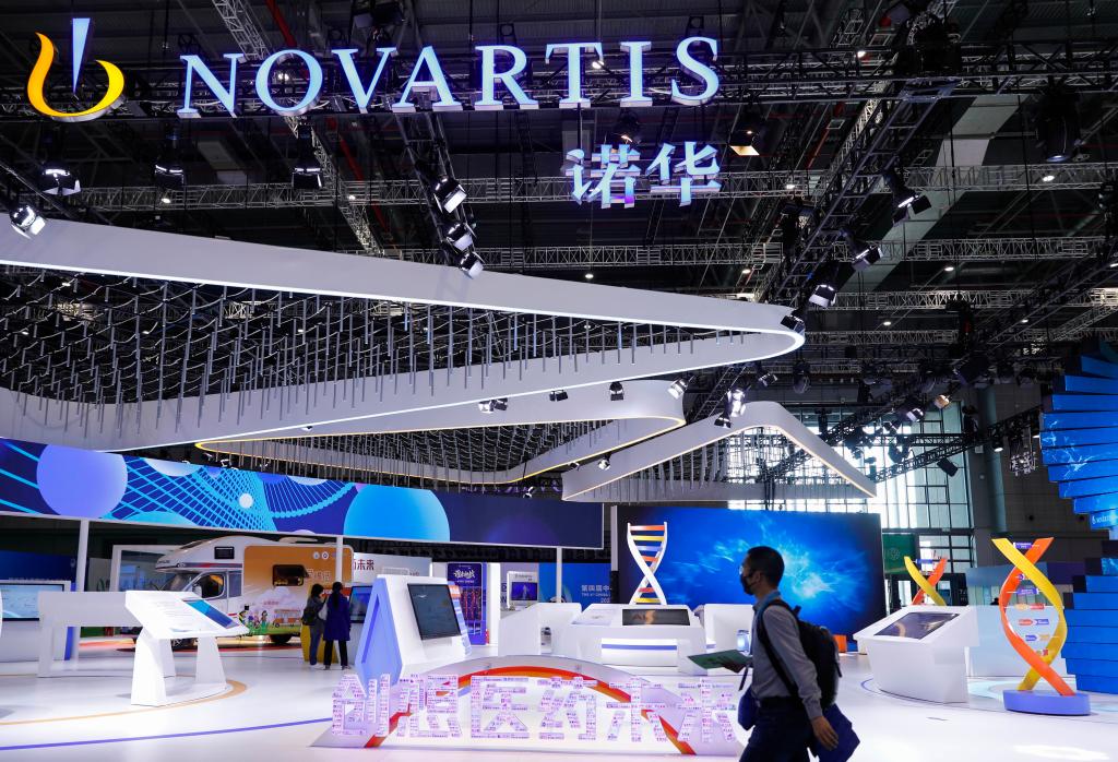 這是2021年11月9日拍攝的進(jìn)博會醫(yī)療器械及醫(yī)藥保健展區(qū)的瑞士諾華展臺。(新華社記者 張玉薇 攝)