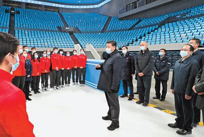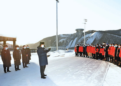 在國(guó)家冬季兩項(xiàng)中心看臺(tái),習(xí)近平觀看了冬季兩項(xiàng)越野滑雪和射擊運(yùn)動(dòng)員接力訓(xùn)練情況,并看望慰問(wèn)國(guó)家冬季兩項(xiàng)、跳臺(tái)滑雪隊(duì)運(yùn)動(dòng)員、教練員和張家口賽區(qū)運(yùn)行保障團(tuán)隊(duì)、建設(shè)者代表。習(xí)近平親切地對(duì)大家說(shuō),我這次來(lái)考察北京冬奧會(huì)、冬殘奧會(huì)籌辦情況,也是在牛年春節(jié)前來(lái)看望大家。大家都在為辦好一屆成功的冬奧盛會(huì)而努力,運(yùn)動(dòng)員在刻苦訓(xùn)練,建設(shè)單位和建設(shè)者、保障團(tuán)隊(duì)兢兢業(yè)業(yè),成功打造了一批世界一流的精品工程,大家的奮斗精神、奉獻(xiàn)精神令人感奮。習(xí)近平強(qiáng)調(diào),北京冬奧會(huì)、冬殘奧會(huì)所有場(chǎng)館建設(shè)提前一年完成,我國(guó)很多冰雪項(xiàng)目在兩年多時(shí)間里實(shí)現(xiàn)從無(wú)到有,有的項(xiàng)目達(dá)到了世界先進(jìn)水平,充分體現(xiàn)了黨的領(lǐng)導(dǎo)和舉國(guó)體制、集中力量辦大事的制度優(yōu)勢(shì)。