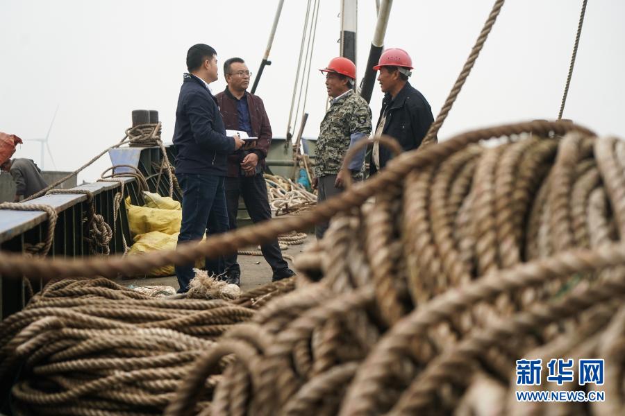 2020年10月21日,江蘇省海安市濱海新區(qū)紀工委干部(左一、左二)向漁船負責(zé)人詢問惠漁油補發(fā)放情況。 新華社記者 季春鵬 攝