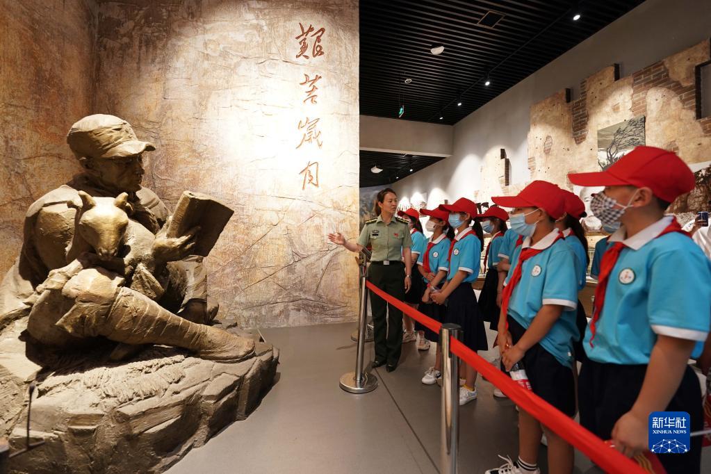 2021年5月30日,在位于河北省邢臺(tái)市信都區(qū)漿水鎮(zhèn)的中國人民抗日軍政大學(xué)陳列館,工作人員向小學(xué)生們講述抗大歷史。新華社記者 牟宇 攝