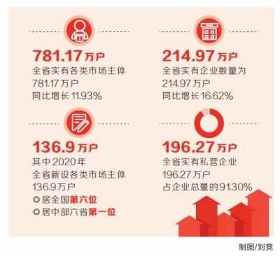 數(shù)據(jù)顯示,截至去年年底,全省實(shí)有各類(lèi)市場(chǎng)主體781.17萬(wàn)戶,同比增長(zhǎng)11.93%。其中2020年全省新設(shè)各類(lèi)市場(chǎng)主體136.9萬(wàn)戶,居全國(guó)第6位、中部六省第1位。