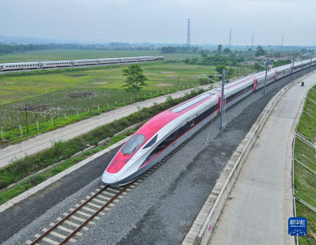 在印度尼西亞西爪哇省萬(wàn)隆市,一列高鐵動(dòng)車組正在雅萬(wàn)高鐵試驗(yàn)段進(jìn)行熱滑試驗(yàn)(2022年11月9日攝,無(wú)人機(jī)照片)。新華社發(fā)(李培養(yǎng)攝)