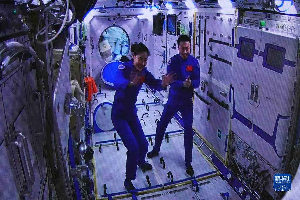 11月30日在酒泉衛(wèi)星發(fā)射中心拍攝的神舟十四號(hào)航天員劉洋、蔡旭哲在問(wèn)天實(shí)驗(yàn)艙迎接神舟十五號(hào)航天員乘組的畫面。新華社記者 郭中正 攝