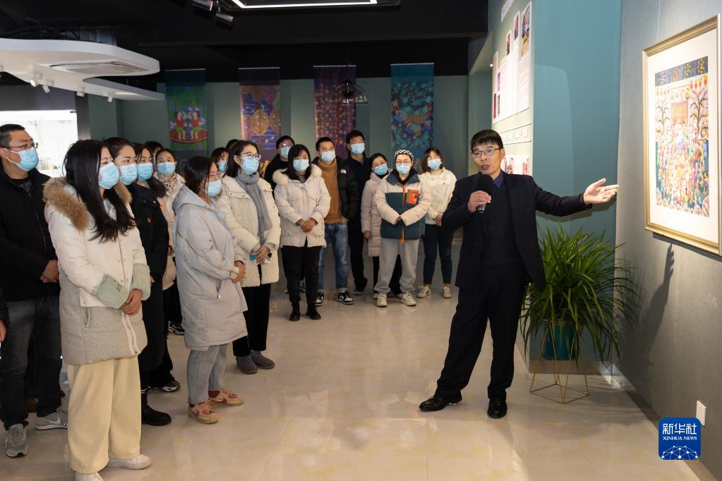 12月4日,江蘇省南京市六合區(qū)農民畫美術館內,一場以江蘇省非物質文化遺產六合農民畫為載體的黨的二十大精神宣講會舉行。這是六合區(qū)冶山街道文體服務中心主任胡斌(右一)帶領參加活動的基層干部群眾參觀農民畫。新華社發(fā) (張夢 攝