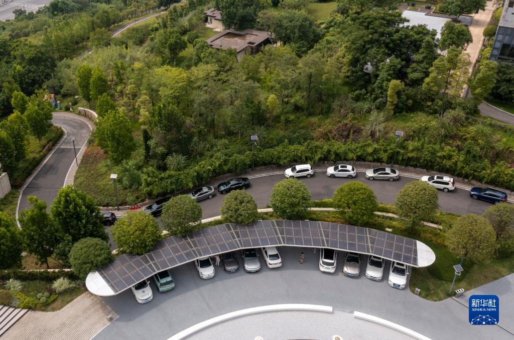 2022年6月16日拍攝的已建成投用的重慶首座光伏充電發(fā)用一體充電站(無人機(jī)照片)。新華社記者 劉潺 攝
